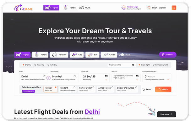 Scale your travel business with FlyBlaze — a leading white label travel portal provider in Dubai trusted by modern travel agencies and OTAs. Launch a fully branded, AI-powered online travel portal in just 14 days, with global inventory, real-time travel APIs, AED payments, and a smart CRM built for the GCC travel market in 2026.